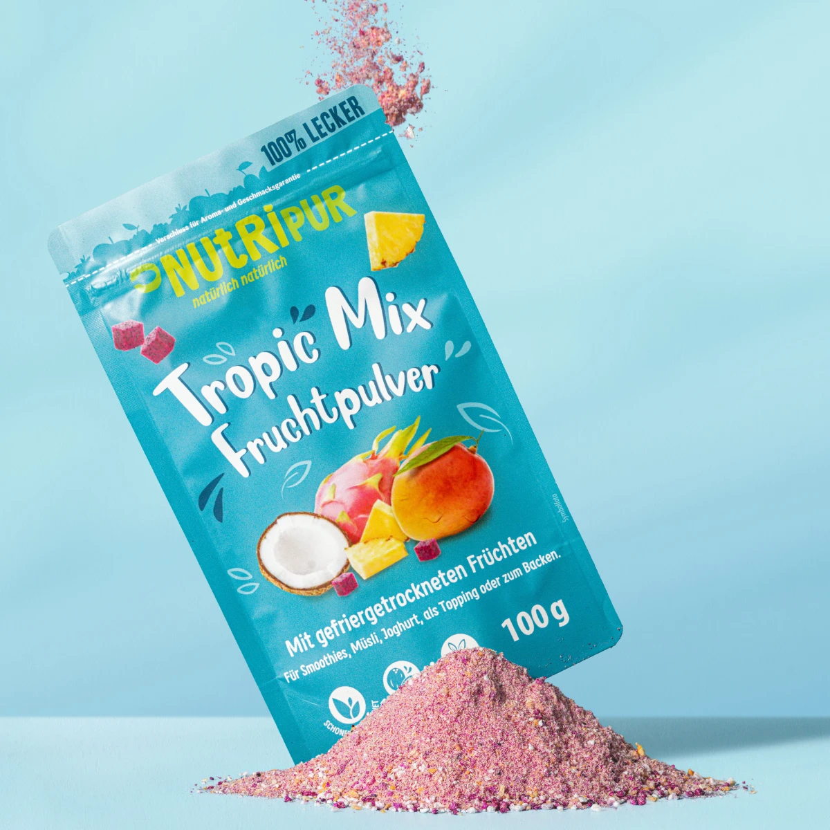 Vores Tropic Mix frugtpulver forener de intense aromaer og næringsstoffer fra ananas, mango, dragefrugt og kokosmælkstilberedning i en perfekt afstemt blanding. Fremstillet hovedsageligt af frysetørrede frugter, giver dette pulver uendelige muligheder for kreative opskrifter og sund nydelse.