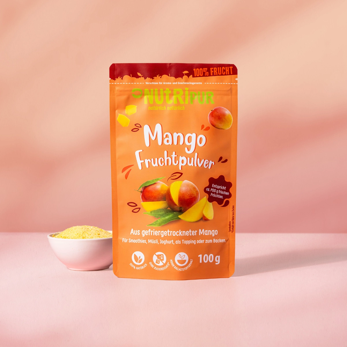 NutriPur mango frugtpulver lavet af frysetørrede mangoer bringer variation til dit køkken. Forvandl nemt yoghurt eller kvark til mangoyoghurt/-kvark med ren, naturlig mango, eller giv din müsli et tropisk touch med to teskefulde mangopulver. Du kan også lave smoothies og lækre desserter med mangopulveret.