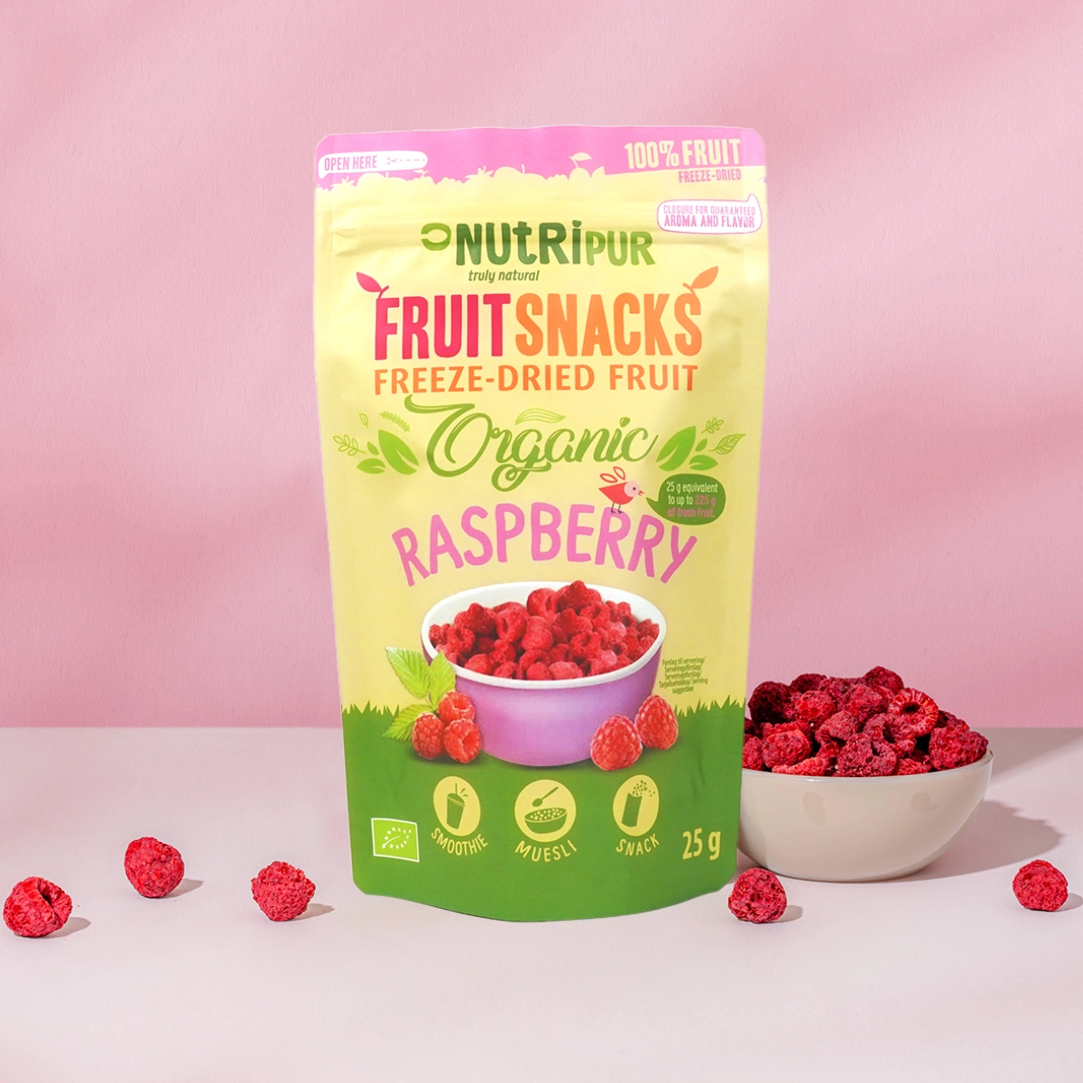 Ren og naturlig — præcis som det skal være: 100 % økologiske, frysetørrede hindbær