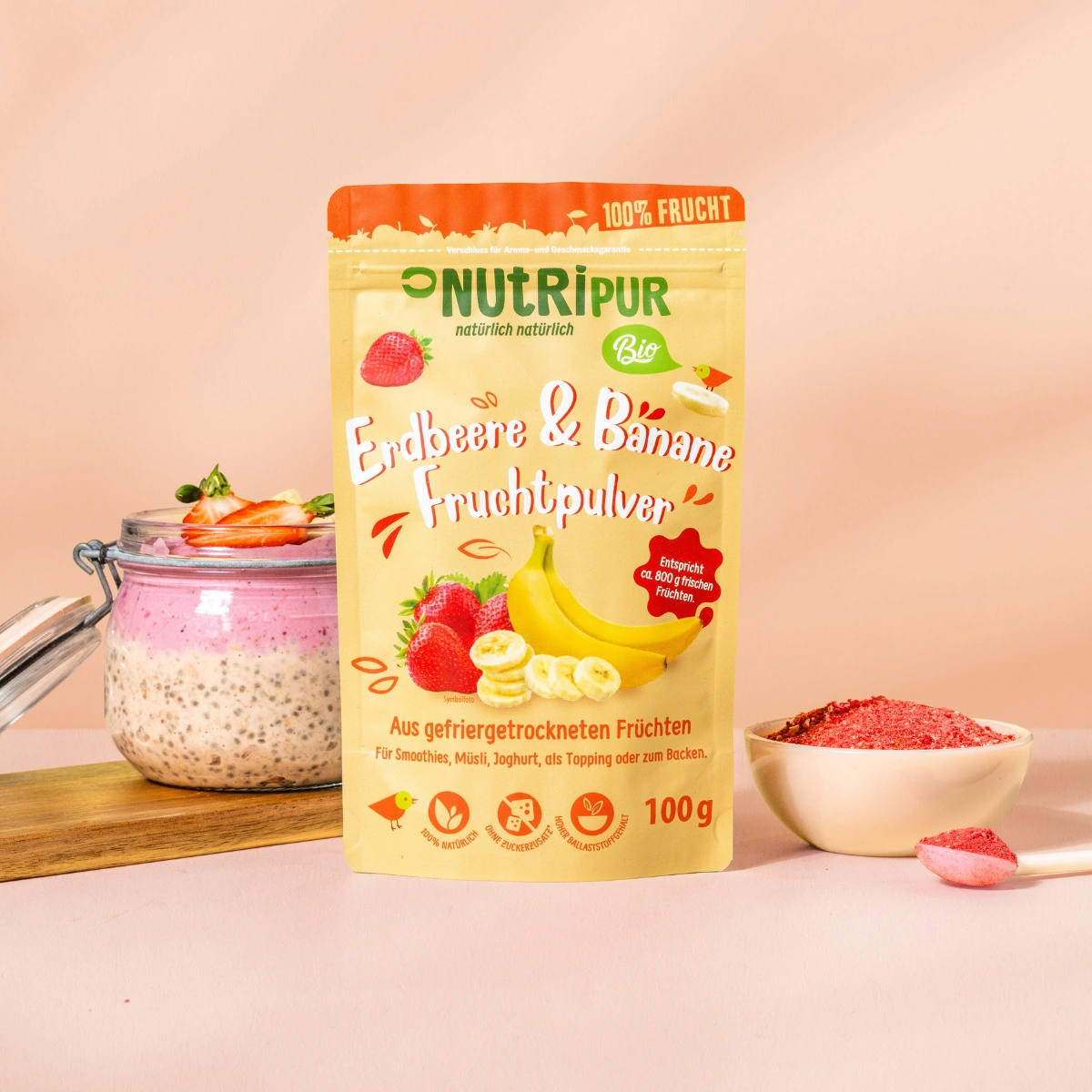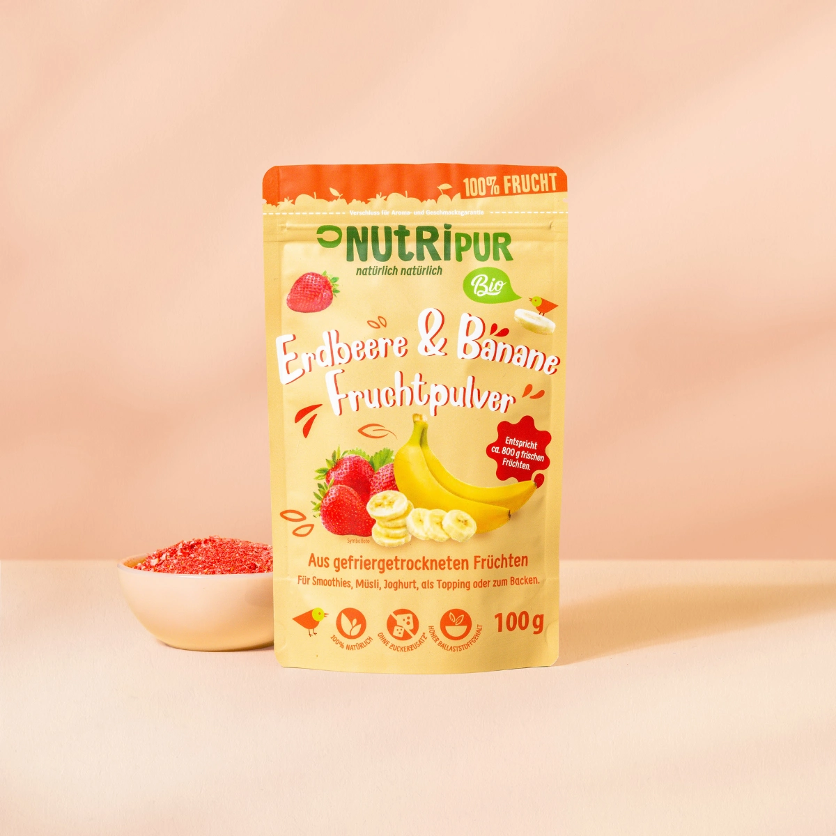 Ren og naturlig: 100 % økologisk frugtpulver lavet af frysetørrede økologiske jordbær og frysetørrede økologiske bananer.