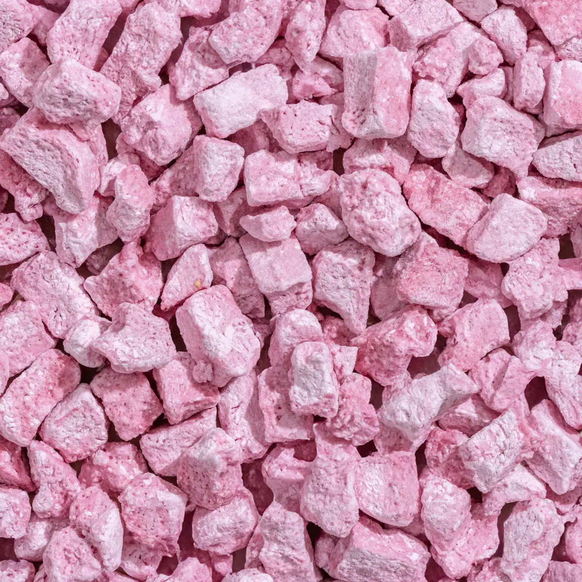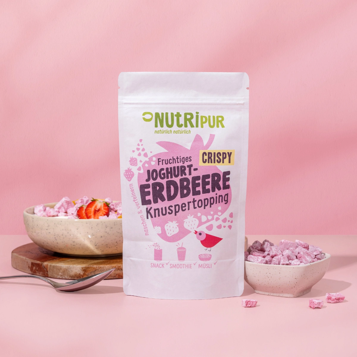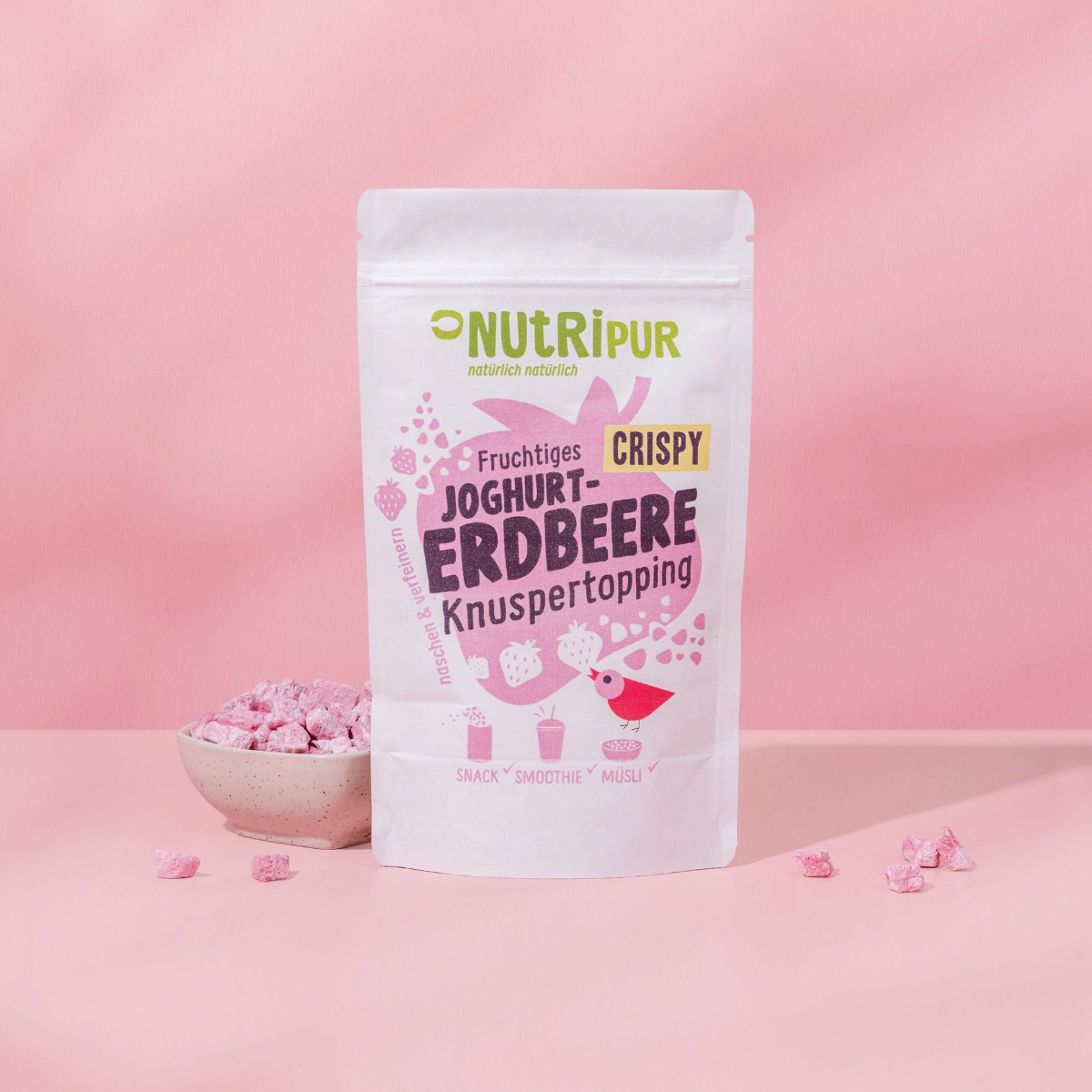 I disse yoghurt-jordbær-crispys forenes den frugtige og intense smag af jordbær med fin yoghurt. De sprøde stykker optager væske meget hurtigt og opløses inden for kort tid. På den måde udfolder de deres fantastiske aroma og giver en lækker variation til din shake, mælk, müsli eller smoothie.