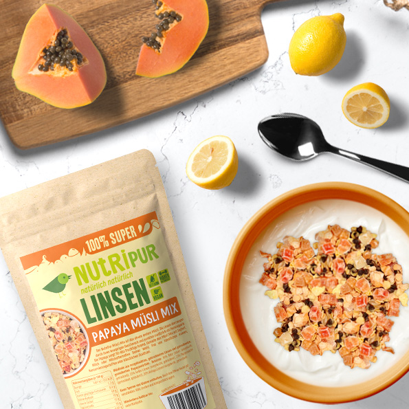 NutriPur High-Protein Müsli Papaya er det lidt anderledes müsli og indeholder tre forskellige linsetyper. Linserne imponerer med deres sprøde konsistens og fungerer samtidig som en god proteinkilde. Den let søde papaya giver en frugtig aroma. Det lækre NutriPur High-Protein Linse-Müsli indeholder cirka dobbelt så meget protein som traditionelle müslier.