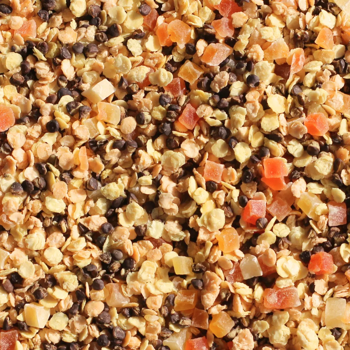 Müsliblanding af forkogte, tørrede linser og tørrede, sukkersøde papayakuber.