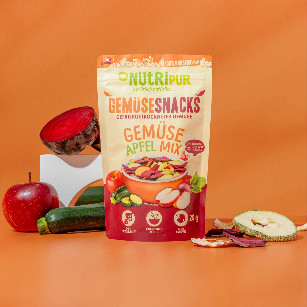 Ren og naturlig: 100% frysetørret grøntsags-æble-blanding med rødbede, zucchini og æble.