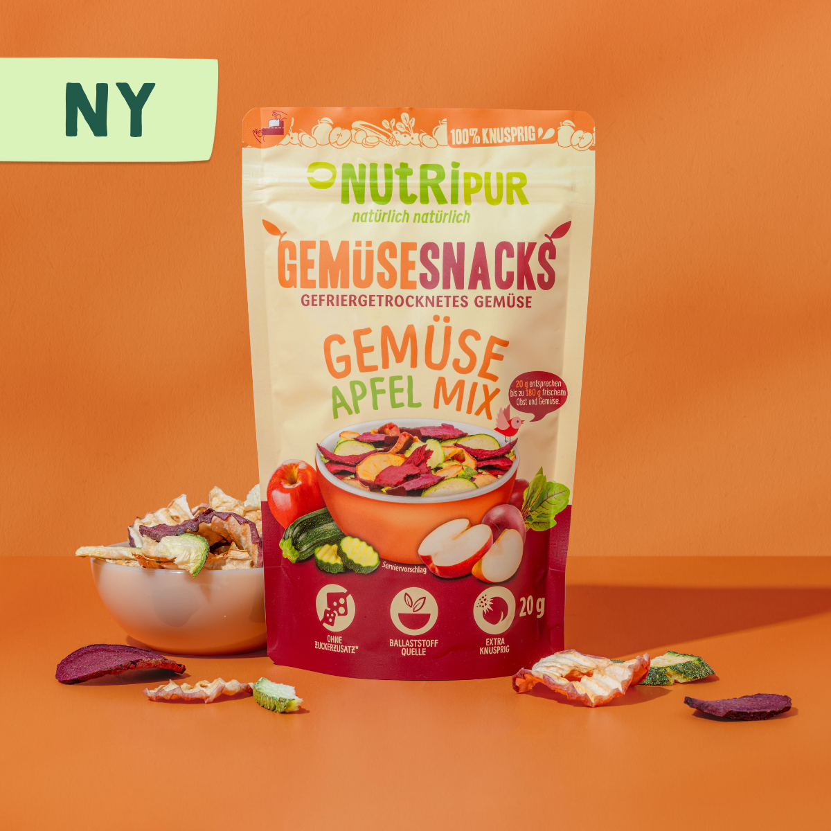 Har du nogensinde snacket frysetørrede grøntsager? Vores frysetørrede grøntsagssnack i grøntsags-æble-mix er et ideelt alternativ til de ellers almindelige andre knasende snacks. De frysetørrede grøntsager er perfekte i salaten, suppen, bowlen – eller som en sund snack i stedet for chips der indeholder en masse kalorier.